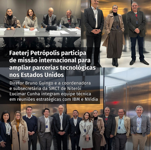 O diretor da Faeterj Petrópolis, professor Bruno Guingo, integra uma missão institucional nos Estados Unidos ao lado da coordenadora Lucimar Cunha - ex-diretora da unidade e atual subsecretária de Inovação, Ciência e Tecnologia de Niterói. A viagem tem como objetivo consolidar parcerias estratégicas voltadas à expansão de projetos de tecnologia no estado do Rio de Janeiro, com foco especial no desenvolvimento do Distrito de Inovação Estação Cantareira, em Niterói.